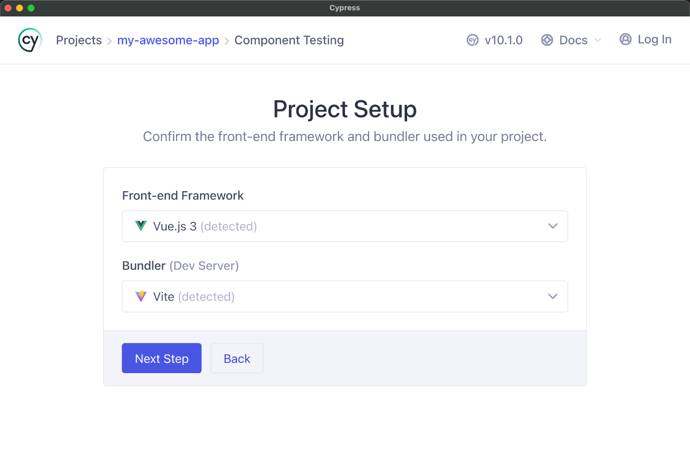 The Project Setup screen automatically detects your framework and bundler, which is Vue and Vite in our case. Cypress Component Testing uses your existing development server config to render components, helping ensure your components act and display in testing the same as they do in production.